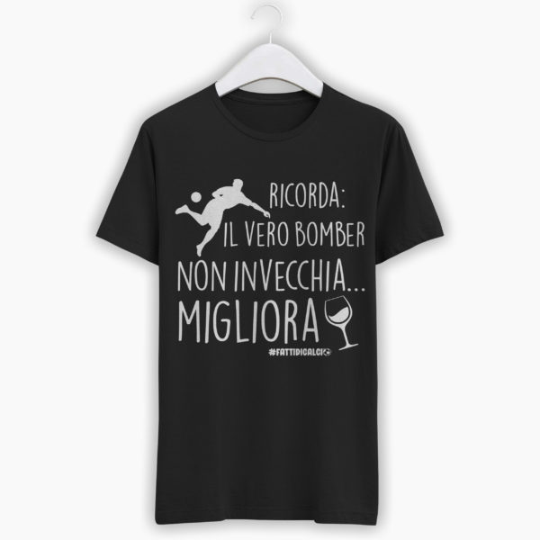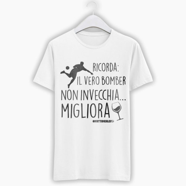 Bellissima t-shirt da uomo tema calcio con la scritta:“Il vero bomber non invecchia… Migliora!” Un’idea regalo unica e speciale da regalare al tuo tifoso preferito.